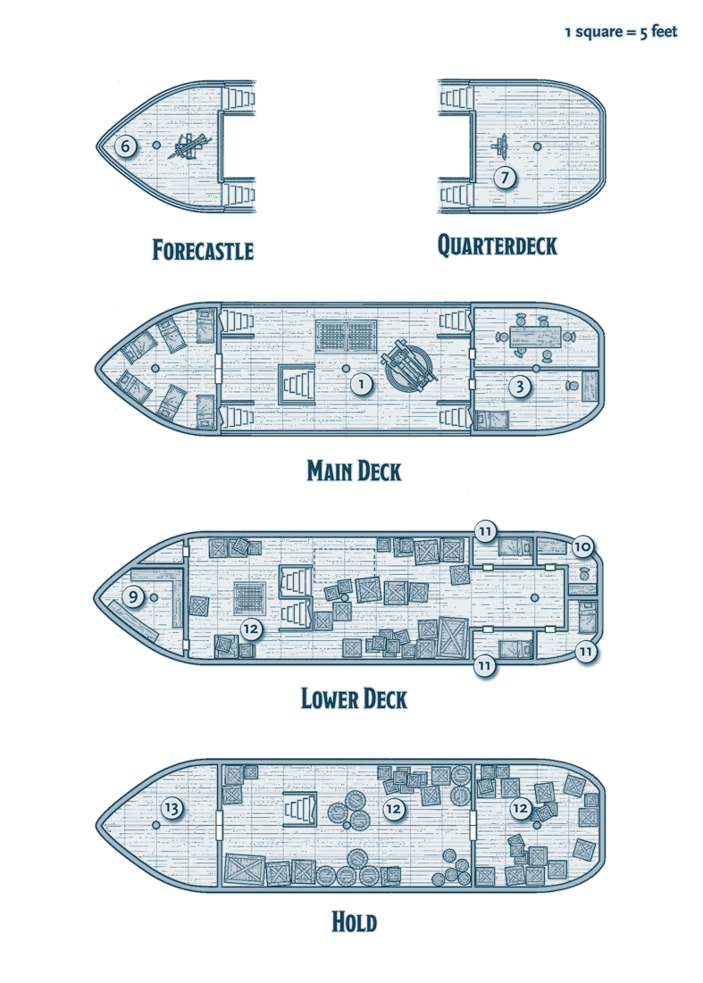 This area houses both passengers and cargo. The ship's off-duty crew sleep on bedrolls among the crates and barrels of food, water, and other supplies.